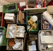 Nombreuses mannettes de bibelots, bijoux fantaisie, verrerie, métal argenté, linge de maison, garde robes, tableaux et mobilier courant. À découvrir ! Les lots acquis sont à enlever le jour même de la vente, à la fin de vacation.